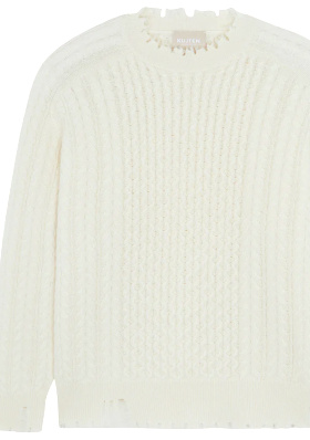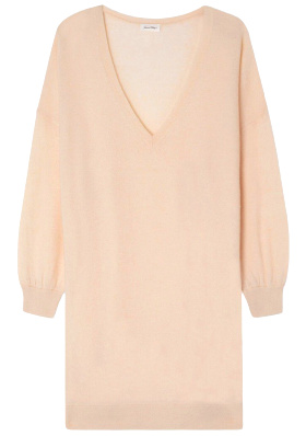 Le marcel blanc se glisse sous la robe-pull qui elle-même se glisse sur la jupe. La jupe plissée ton sur ton, portée sous la robe, crée un jeu de superpositions fluides qui renforce la féminité du look. Le blouson oversize, porté ouvert, apporte une note légèrement rugueuse qui contrebalance la douceur des teintes poudreuses. Le bonnet injecte une touche de fraîcheur au duo fauve/rose poudré.