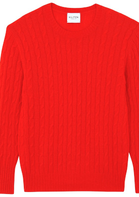 La jupe grise allège l'impact des pièces unisexe du look. Le pull rouge vivifie l'ensemble sans pour autant verser dans l'excentricité stérile. Le tee-shirt blanc dépasse légèrement sous le pull. Les bottes ancrent la silhouette et contrastent avec la féminité de la jupe. La finesse des créoles argentées crée un contrepoint subtil au volume masculin du blouson en cuir.