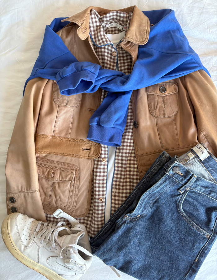 Look 1 (voir ici) : Veste en cuir camel Zara (ancienne collection) + tee-shirt blanc CQFD + sweat bleu cobalt Arsène et Pipelettes + jean large brut + baskets blanches