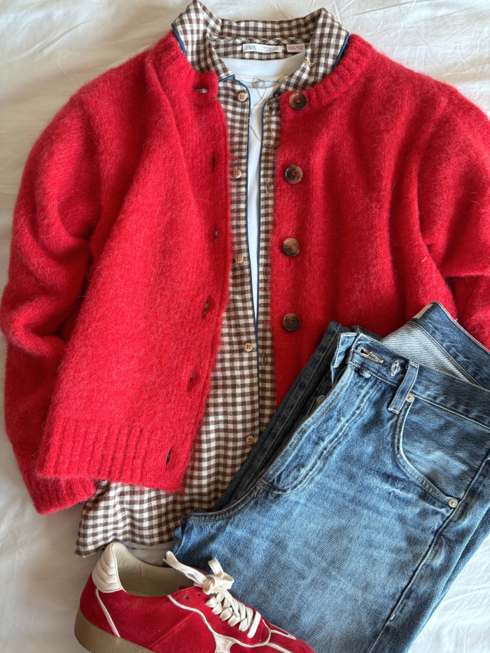Si j'aime le côté chaleureux - presque "petite fille bourgeoise" - du duo gilet rouge/chemise à col Claudine, j'apprécie encore davantage de le détourner en portant la chemise ouverte sur un tee-shirt blanc, associée à un jean large tombant franchement sur une paire de baskets rouges. Créant un rappel chromatique avec le gilet, ces dernières confèrent une harmonie visuelle à l'ensemble.