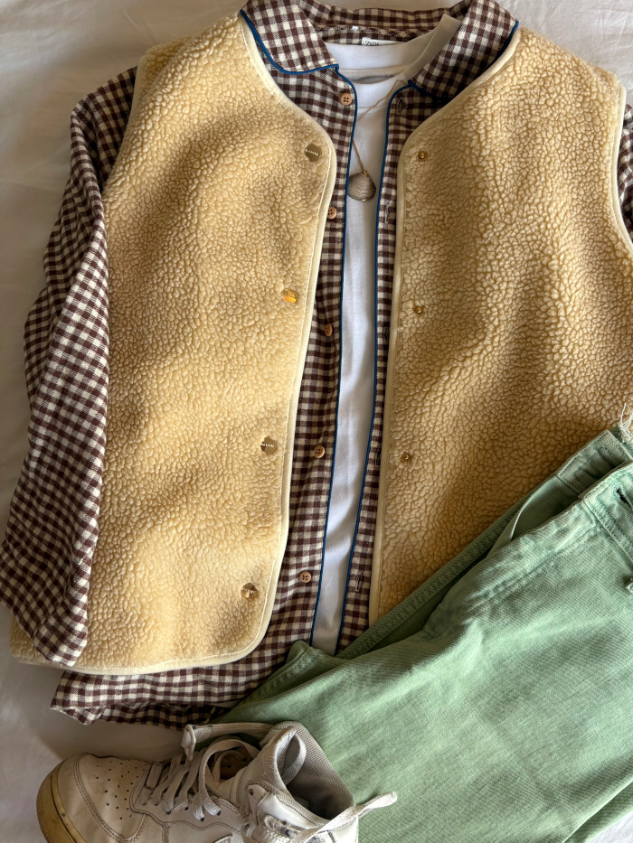 Travaillés dans les mêmes teintes (marron et bleu), les imprimés du gilet et de la chemise m'ont donné envie de les associer. Le tee-shirt blanc fait respirer le duo, tandis que la dimension casual et un peu roots du pantalon patine le côté girly du gilet. Le vert des baskets apporte quant à lui une nuance inattendue qui modernise la silhouette.