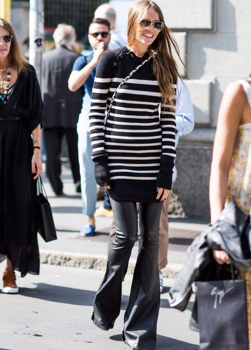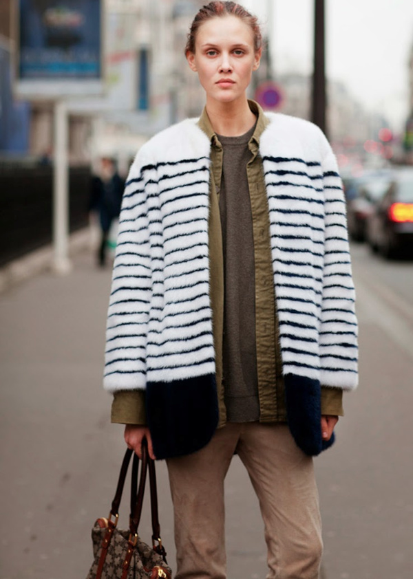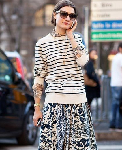 Travailler les rayures en duo (voir ici et là). Oser la fausse fourrure sobrement rayée (à mixer avec un look utilitaire) (voir ici). Porter ses robes-pulls marinière sur un jean ou un pantalon flare (voir ici). Jouer avec les imprimés tout en respectant les harmonies de couleurs (voir ici). Télescoper la douceur romantique d'un ample jupon blanc avec la rugosité d'un large pull marinière (voir ici). User et abuser du trio léopard/blazer bleu marine/rayures marinières (voir ici). Se rappeler que les rayures marinières apprécient tout particulièrement la compagnie du daim fauve (voir ici). Contrebalancer la légèreté d'une marinière au coton distendu en enfilant une épaisse peau lainée (voir ici). S'essayer au turban (ou pas) (voir ici). Glisser une sobre marinière sous un blazer masculin (voir ici). Marier régulièrement carreaux, rayures horizontales et tacheté léopard (voir ici). Miser sur la subtilité en ne laissant apparaître qu'une toute petite partie de la marinière (voir ici). Travailler en duo marinière souple et grosse maille (voir ici). Oser la version "robe pull longue" de la marinière de Coco Chanel (voir ici). Profiter de leur impact graphique pour faire des tops à rayures horizontales les meilleurs alliés des gilets et autres pièces sans manches (voir ici). Penser à dynamiser les rayures bleu et blanc au contact d'un éclat argenté (voir ici). Garder à l'esprit que l'ADN utilitaire de la marinière se marie fort bien à la nature festive des sequins (voir ici).