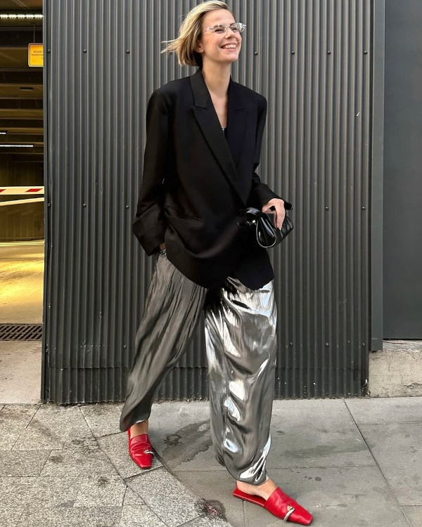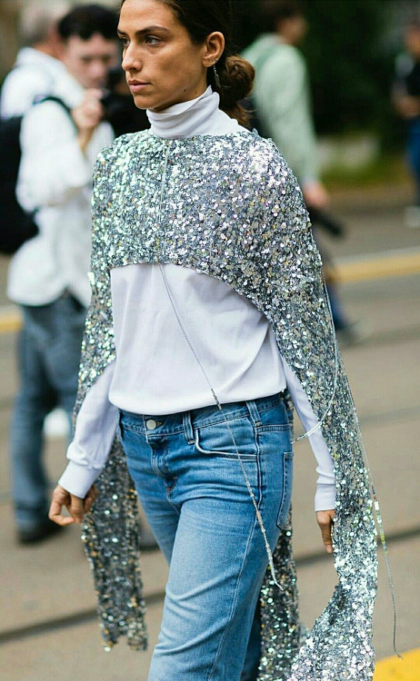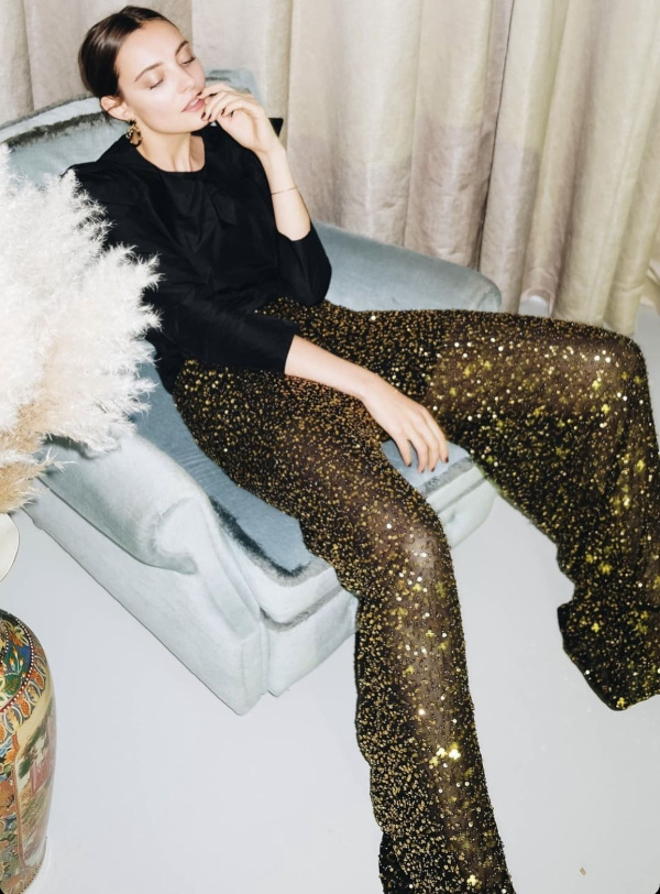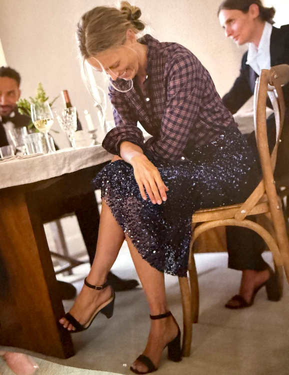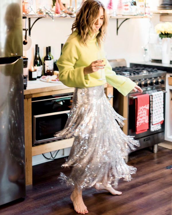On pourra ainsi : Tempérer l'éclat scintillant d'un pantalon à sequins en lui associant un pull fin tout simple (voir ici). S'autoriser à porter des plumes en touches, en bordures de manches de robe ou de pyjama chic. Si elles sont accompagnées de bonne humeur, ces dernières confèreront à coup sûr une divine légèreté à la silhouette (voir ici). Ne pas hésiter à traiter son jean fétiche (celui dans lequel on sent aussi belle que confortable) comme un sapin de Noël à part entière en le saturant d'éléments brillants (voir ici et là). Accompagner d'un top minimaliste sobrissime le duo jupe midi ultra sophistiquée/talons de 12 cm (voir ici). Allier fragilité festive et douceur réconfortante en mariant jupon diaphane et épais pull-over, et en misant sur un camaïeu de teintes pour harmoniser l'ensemble (voir ici). Penser à organiser un "speed-dating" entre sa jupe droite à sequins et la chemise à carreaux de son mari : si celles-ci évoluent dans le même champ chromatique, il y a de fortes chances que l'issue du rendez-vous soit heureuse (voir ici). Oser le vert scintillant que l'on apaisera via une coiffure simple et un quasi no make-up (voir ici). Aller vers des robes à sequins de coupes sages, leur parure se suffisant largement à elle-même pour égayer la silhouette (voir ici). Saupoudrer de "casualness" chaleureuse le trio coiffure soignée/rouge à lèvres/boucles d'oreilles en lui associant un généreux pull col roulé bleu marine (voir ici). Miser sur une barrette (ou plusieurs) de caractère afin de pouvoir faire extrêmement simple sur le reste du look (voir ici et là). Dénicher son jupon le plus ample et le plus féminin et le réchauffer au creux d'un pull fleurant bon les montagnes islandaises (voir ici). Se servir du blazer noir pour patiner ses pièces les plus extravagantes (voir ici). Réserver le trio micro jupe/veste cropped/collants pailletés à celles officiant sur OnlyFans (voir ici).