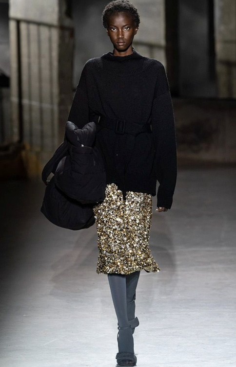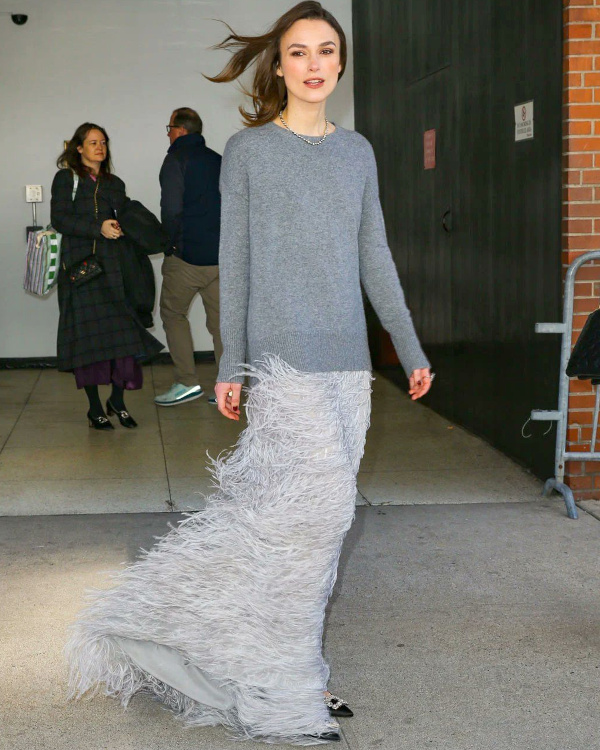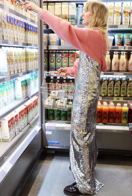 Se contenter du minimum en misant sur une tenue beige/blanc rehaussée d'une paire de boucles d'oreilles scintillantes et d'un trait de rouge à lèvres (voir ici). Dédramatiser ses robes à fines bretelles en glissant en dessous une petite laine (attention à ce que la "petite laine" ne soit pas trop envahissante). Céder à l'appel cosy-festif des chaussettes à paillettes (voir ici). Assumer sa passion pour le Lac des cygnes en se glissant dans une longue jupe à plumes (on veillera à tempérer l'aura féérique de cette dernière en l'associant à un pull col rond unisexe) (voir ici). Faire la part belle au total look noir jouant avec les textures (voir ici). Se prendre pour un personnage de Wes Anderson : si on ne se l'autorise pas à Noël, quand pourrions-nous le faire ? (voir ici). Plus que jamais au moment des fêtes, le camaïeu de teintes/mix de textures est à consommer sans modération (voir ici). Ne pas réserver au Père Noël le port du costume rouge (à condition de choisir le sien bien coupé et de le porter avec une chemise audacieusement déboutonnée) (voir ici). Allier robe noire en plumetis (en dentelle, à sequins ou autres) et paire de baskets noires et blanches (voir ici). Assumer son désamour des tenues de fêtes en optant pour un look de grand-père joyeux ou de Texane glamoureusement déprimée (voir ici et là). Allier longue jupe de sirène argentée et pull-over jaune acide (voir ici). Dompter la sexiness d'une jupe ultra fendue en l'associant à un pull col rond ton sur ton (voir ici). Garder à l'esprit qu'un seul élément esprit "boule à facettes" suffit pour transformer un look sage en un look festif (voir ici et là). Ne pas hésiter à reconduire au-delà des fêtes le duo pull ample/jupe à sequins midi (voir ici).