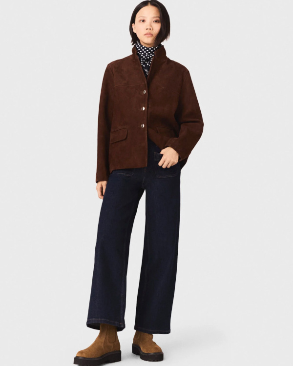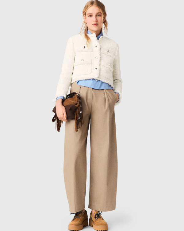 Dédramatiser la veste en tweed en la mixant à un pantalon barrel 7/8 (Maje).
