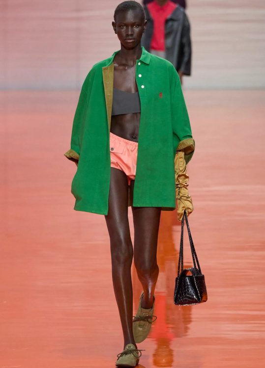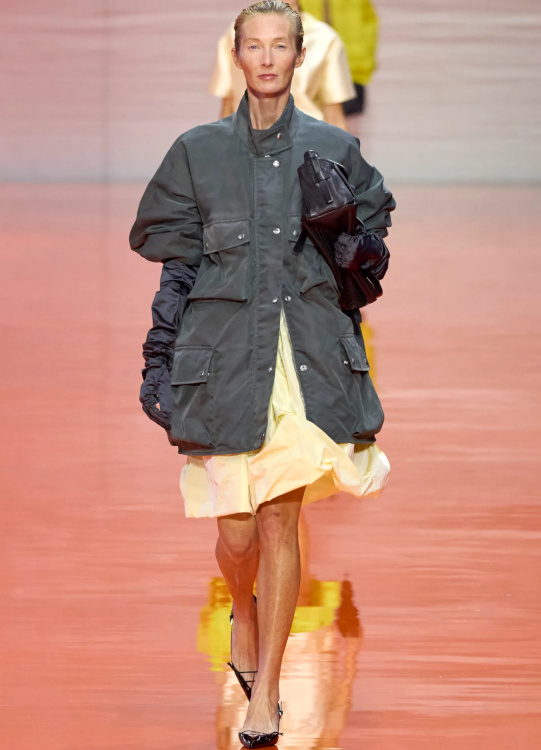 Réchauffer le vert gris via un jaune beurre ultra pâle patinant sa rigueur militaire (Prada).
