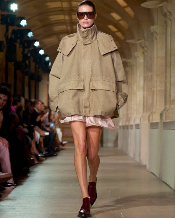 Marier la dimension utilitaire du beige olive avec la coquetterie du rose champagne (Victoria Beckham).