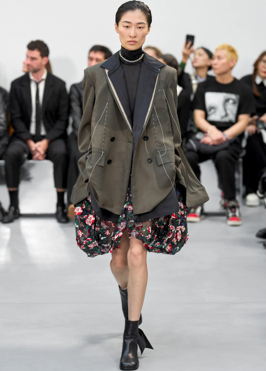 Réchauffer ses jupes fleuries au contact d'un blazer kaki (Sacai).
