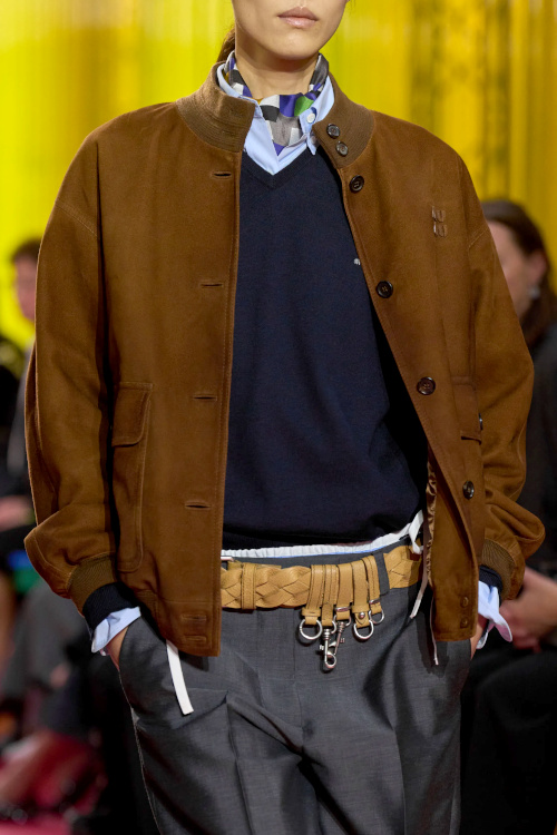 Marier bombers marron, fin pull bleu marine, chemise bleu ciel et petit foulard noué près du cou (Miu Miu).