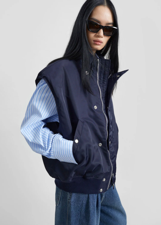Superposer chemise à rayures "working girl" et blouson sans manches légèrement oversize (The Frankie Shop).