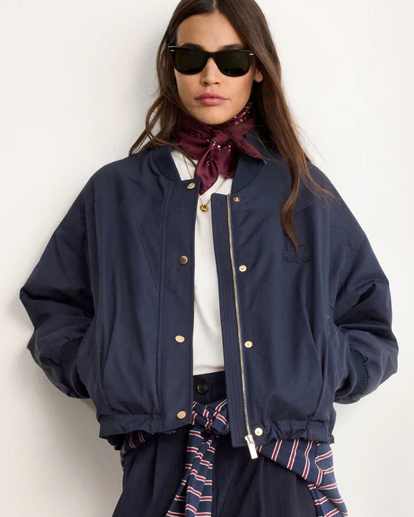 Associer bomber bleu marine et foulard bordeaux noué près du cou (Pablo).