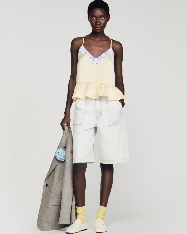 Réveiller ses bermudas en osant leur mixer un top à basques (Sandro).